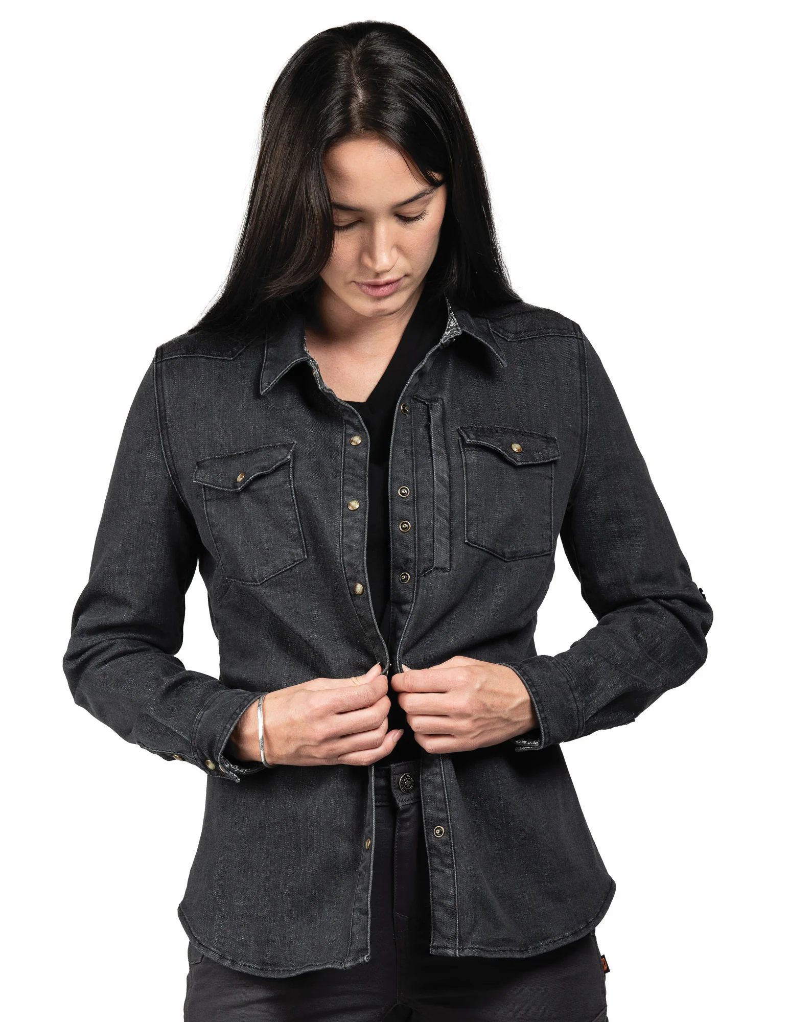 Giddyup, gals: a new western shirt just rode into town. This isn’t our first rodeo– since our Zeller denim work shirt started selling out, Dovetail dreamt of turning the great western design into the greatest denim shirt ever. The stunning design reveals its utility all day long. Pearl snaps still serve classic cowgirl, but a new interior chest snap prevents gaping, so the girls don’t get loose. Back darts improve the fit and make it easy to move. Roll up your long sleeves when work warms up, or you need a pop of paisley. You’re gonna wipe your safety goggles or glasses on your shirttail (don’t we all?), so there's an interior microfiber cloth to keep those lenses scratch-free.